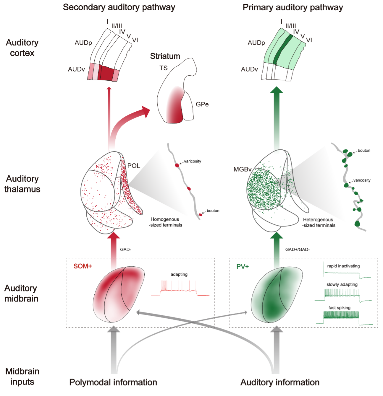 图-3 中脑PV+和SOM+神经元分别介导了两条平行的听觉中脑-丘脑环路